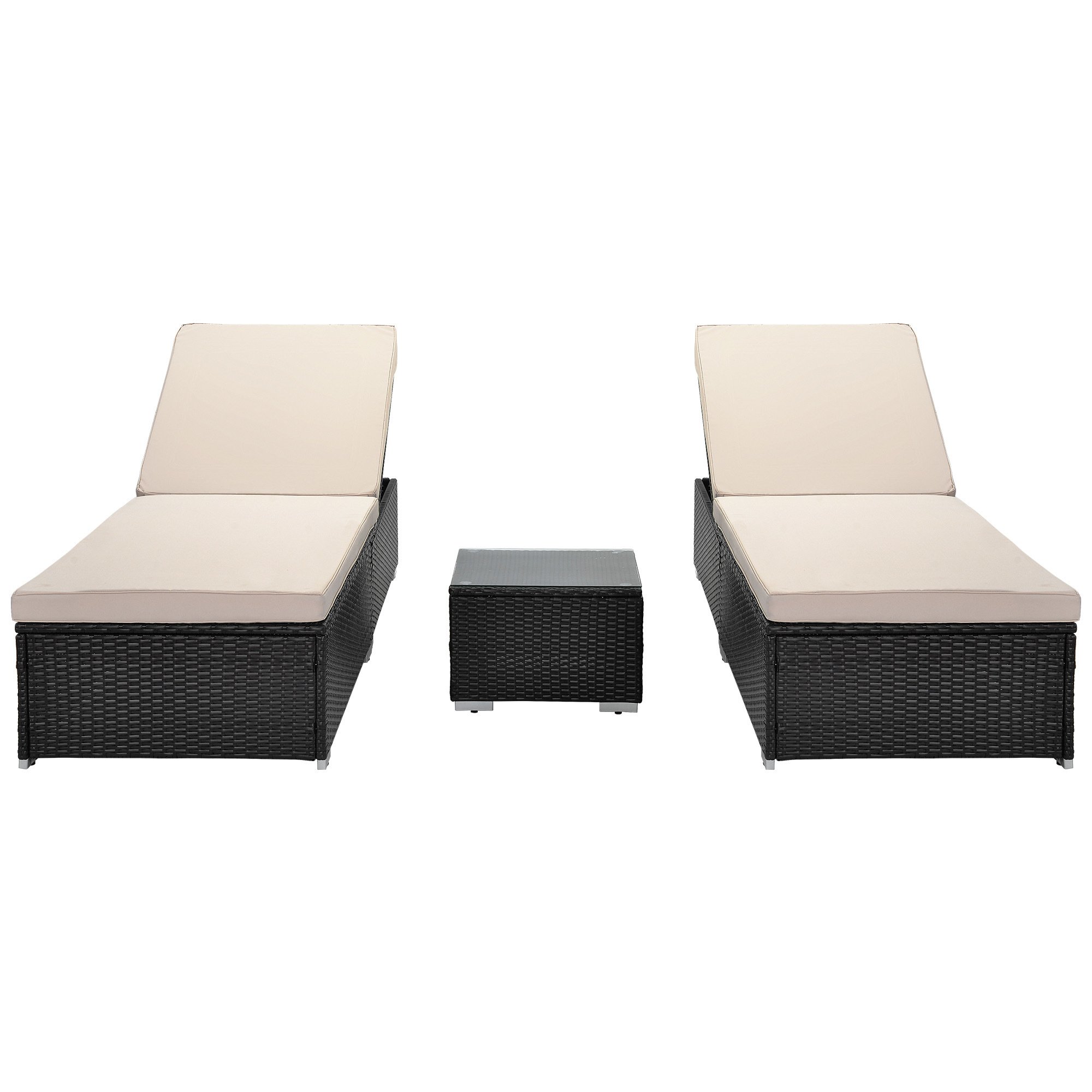 3 Piece Wicker Patio Chaise Lounge Set Outdoor Adjustable Rattan Reclining Chairs with Cushions and Side Table.