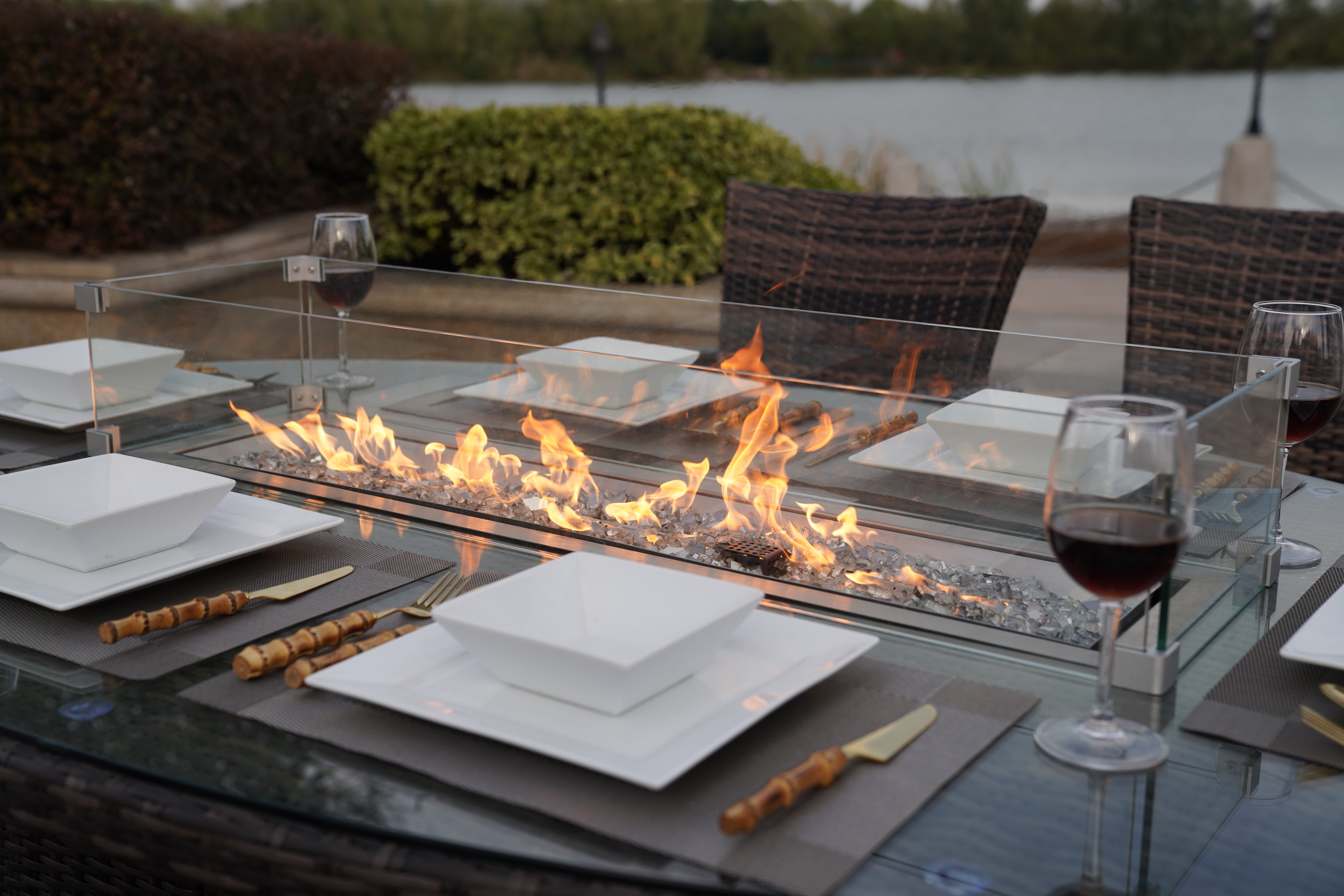 1. The Eton Dining Collection is the ideal mix of craftsmanship, style and comfort. The dining table has a gas fire pit with multiple heat settings so you can prolong your outdoor relaxation into the night.