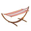 Laze away your day on this single-person hammock with an included stand. The wood crescent arc stand creates a stunning silhouette while providing stable support for the hammock with the wood stretcher bars and heavy-duty hanging loops. Durable cotton material makes this hammock comfortable and sturdy.